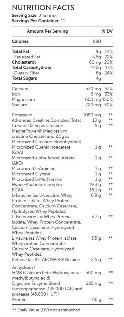 بالابردن توان عضلانی: این  مكمل محتوی ترکیباتی است که بر اساس تحقیقات بالینی باعث افزایش اندازه‌ی عضلات و تقویت آن‌ها می‌شوند. این محصول محتوی 60 گرم پروتئین است که به داشتن عضلاتی آماده کمک می‌کند و هم‌چنین محتوی 140 گرم کربوهیدارات با کیفیت بالاست که به افزایش حجم عضلات شماکمک می‌کند.