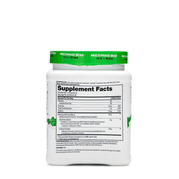 ترجیحا به عنوان نوشیدنی همراه غذا میل شودPERFORMIX ISO SYM این اطمینان را به شما میدهد که عضلات شما هرگز به دلیل کاهش وزن از بین نروند. این محصول برای افرادی طراحی شده است که خواهان تحول و دگرگونی جسمانی واقعی هستند. محصول ما از ترکیب 8/1 گرم CLA، 500 میلی گرم L-Carnitine و 3 گرم از BCAAها تشکیل شده است که به چربی سوزی کمک کرده و در عین حال به داشتن و حفظ عضلاتی خوش فرم نیز کمک میکند. ذرات ISO ما که در طول زمان آزاد میشوند به آزادسازی طولانی مدت BCAAها برای بهبود و سلامت، حمایت از عضلات و هیدراسیون کمک میکند. این ترکیب از فناوری تعیین دوز هوشمند TERRA استفاده میکند که ان را به یک سیکل تمام روز، و ضد فروساخت بافتهای بدن کمک می کند.