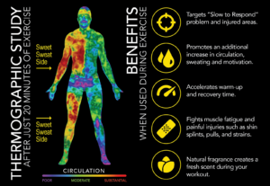 مطالعه انجامشده در مؤسسه عملکرد UFC نشان داد که استفاده از Sweet Sweat باعث افزایش ۱.۳ درصدی تعریق نسبت به گروه کنترل شده و بهطور میانگین باعث کاهش ۲۱۰ گرم از وزن بدن در هر جلسه تمرینی شده است.