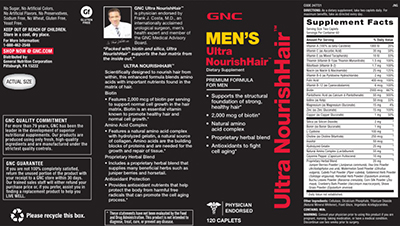 این مکمل محتوی بیوتین و سیلیکا، Ultra NOURISHHAIR است که بافت و ساختار مو را هم از درون و هم از بیرون تقویت می کندULTRA NOURISHHAIR تولیدی GNC یک فرمول خاص غذایی است که برای تقویت درونی مو و با بهرهگیری از دانش روز تولید شده است. این فرمول به ترکیب آمینو اسید با مواد غذایی مهم یافت شده در زمینهی مو کمک میکند.