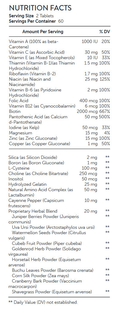 این مکمل دربردارندهی یک ترکیبب گیاهی ویژه است که از گیاهان مفیدی مانند درخت عرعر(Juniper berries) و horsetail در ترکیب خود استفاده میکند.