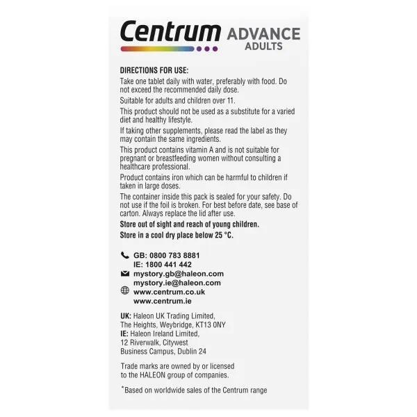 اگر بهدنبال یک مولتیویتامین کامل و علمی برای حمایت همهجانبه از سلامت بدن خود هستید، Centrum Advance Adult یکی از بهترین انتخابها برای شماست. این مکمل تحت حمایت بیش از ۴۰ سال تحقیقات برند معتبر سنتروم، بهگونهای طراحی شده که پاسخگوی نیازهای روزانه بزرگسالان باشد.