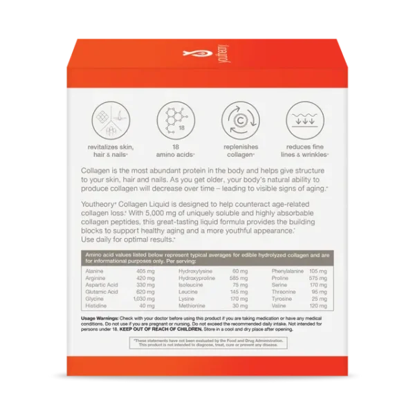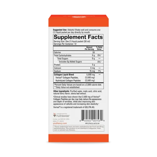 Youtheory Collagen Liquid با تأمین ۵۰۰۰ میلیگرم کلاژن هیدرولیز شده در هر وعده، به بازسازی ذخایر کلاژن بدن کمک کرده و از زیبایی از درون پشتیبانی میکند.
