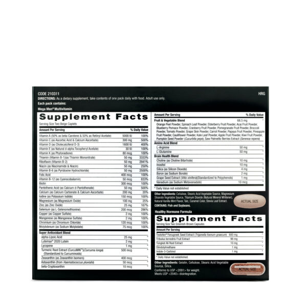 حاوی بیش از ۳۰ مورد مواد مغذی تخصصی مولتی ویتامین و انتی اکسیدان قوی مورد آزمایش و مطالعه قرارگرفته برای سلامت اقایان مبارزه با پیری سلول و حمایت از کولون و رگ هاپک ویتامینی سلامت تستسترون اقایان