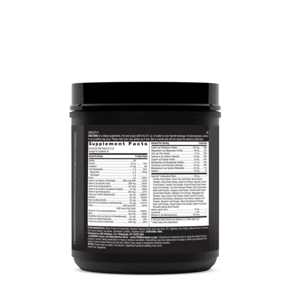 پروتئین وی کنسانتره، فیبر محلول تاپیوکا، پودر کاکائو، طعمدهندههای طبیعی، و مقدار کمی از صمغ زانتان، لسیتین آفتابگردان و سوکرالوز.
